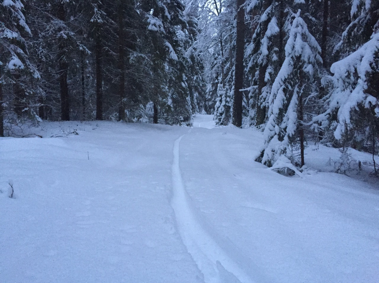Hauskimmaksi on osoittaunut kelkkareittien ajaminen läskillä! Talven vähäinen luonnonlumi ja välikauden vesisateet verottivat kelkkailijoita, mutta nyt on reittejä alkanut ilmestymään. Kelkan jäljet ovat kuin parhaita kesäisiä neulaspolkuja. Reitille jää kelkan telasta “aaltoja”, joista saa tehtyä hienoja hyppyjä. Pitkin sähkölinjoja ja muita maastoreittejä kulkevat kelkkareitit tarjoaa mahdollisuuden pitkiinkin lenkkeihin ja reiteillä ei turhaan vältellä korkeuseroja (kyllähän sitä moottorilla jaksaa). Tämä tietysti tekee toisista pätkistä loistavia lumi-DH settejä, joissa ympäröivä valkoinen pehmike luo ehkä hieman valheellistakin turvallisuuden tunnetta :).
