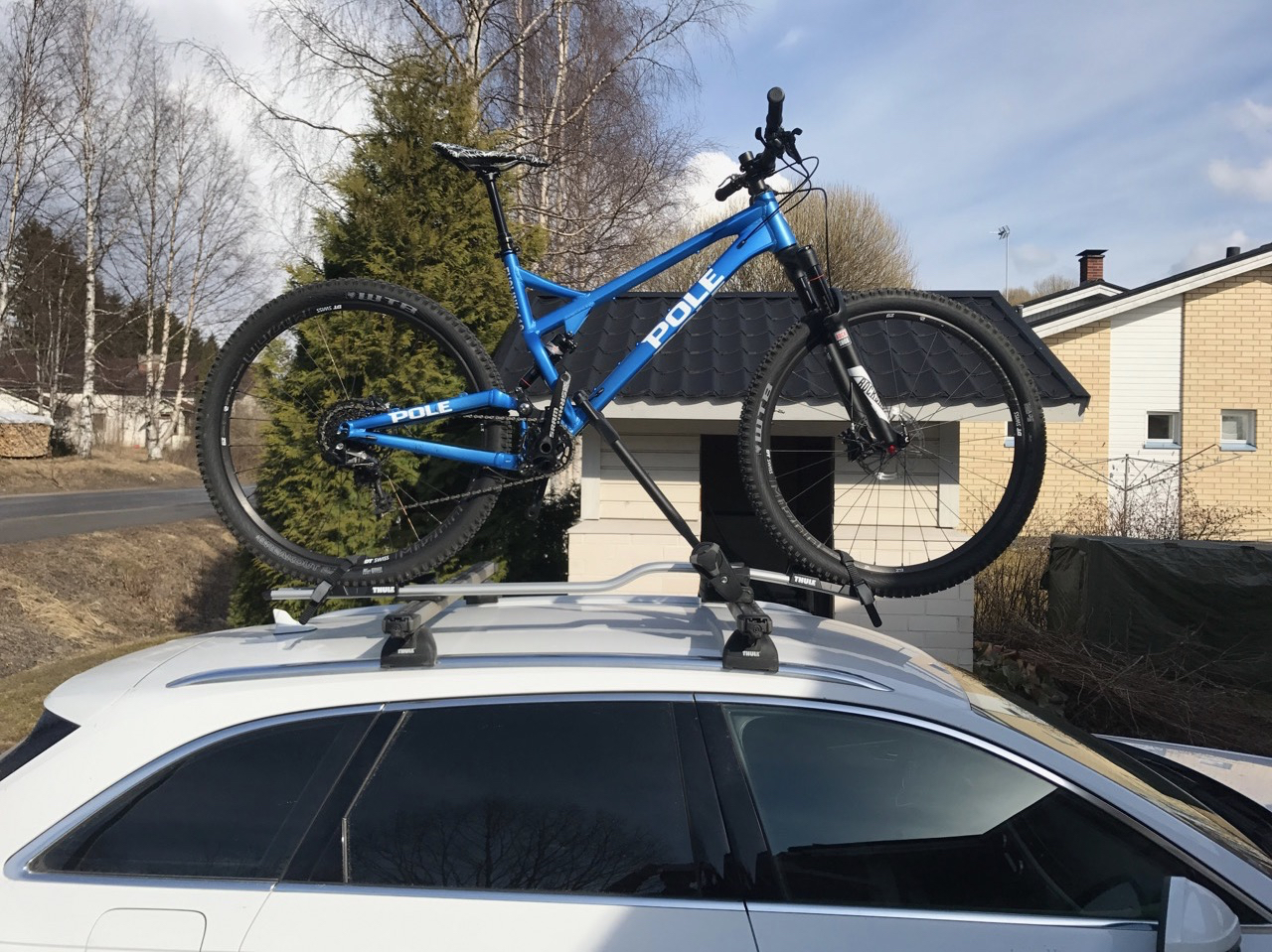 Polen liikkeellä Vaajakoskella oli demopyöriä telineissä odottamassa. L-kokoinen Evolink 110 nostettiin alas ja pyörä näytti ensisilmäyksellä erittäin maastokykyiseltä. Se on luonnossa paljon paremman näköinen kuin kuvissa. Pyörä on suorastaan monsteri ja tuntui jo autoa kohti taluttaessa todella tukevalta. Eturengas pyörii kaukana tangon etupuolella. Katolle nostaessa tietysti huomasi, että mistään XC fillarista ei ole kyse tällä kokoonpanolla…