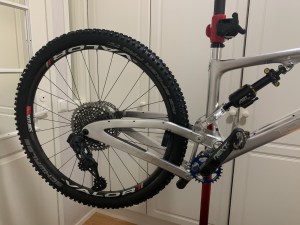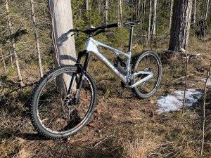Pole Stamina 140 rungosta kasaantui lopulta huikean hieno pyörä. Keulana on 140mm joustava RockShox Pike RCT3, vaihteet XX1 Eagle AXS, kammet RaceFace Next SL G5 170mm ja jarruina luotetut, tunnokkaat SRAM Guide Ultimatet. Ensimmäiset muutamat lenkit ajoin vielä nastarenkailla, mutta jäiden sulaessa poluilta vaihdoin alle Michelinin Wild AM + Force AM parin. Alkuun iskarin säädön kanssa sai pelata jonkin verran säilyttääkseen tietynlaisen pintaherkkyyden pitäen samalla ajettavuuden jämäkkänä. Muutamien säätölenkkien jälkeen pyörä alkaa olla kovassa iskussa ja kuskikin jo tottuneempi sen käytökseen. Kuva lenkiltä, jossa kiipeiltiin Muuratsalon mäkiä ja laskettiin rymistellen alas, Stamina oli elementissään molempiin suuntiin. Kuski yrittää piilotella XC-spandexia enduroshortsien alle… 🙂