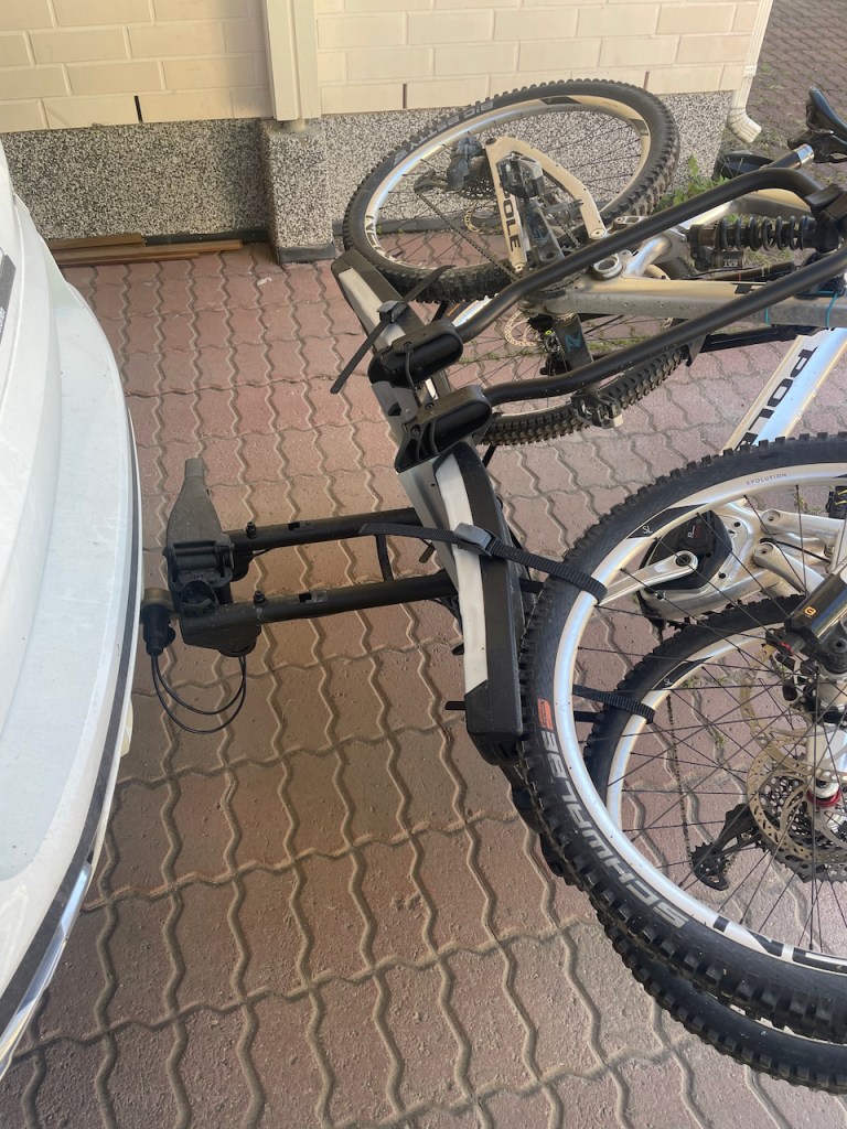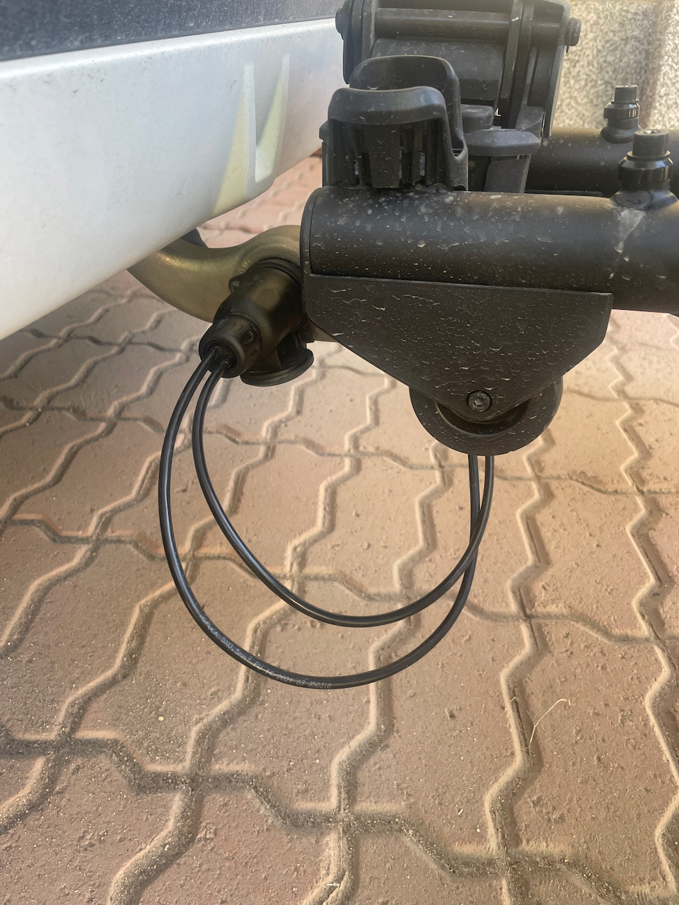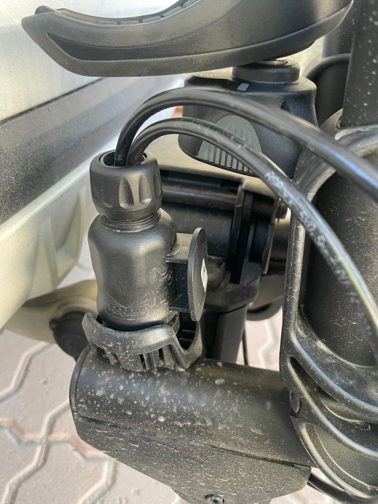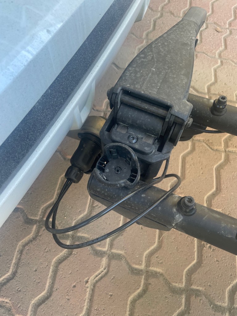 Teline tulee 13-napaisella liittimellä, joka käy minun autoon suoraan. Peräkoukkutelineen ollessa paikallaan auto kuvittelee, että siihen on liitetty perävaunu. Tämä ei välttämättä ole kovin hyvä asia. Ainakin minun auto kytkee pois tiettyjä avustavia järjestelmiä ja aktivoi perävaunun ajonvakautuksen. Esimerkiksi kaistanvaihtoon liittyvä varoitusjärjestelmä on poissa pelistä. Pistokkeen johdot on hieman pitkät ja yritin laittaa ne tuon putken yli. Tämä ei ole kuitenkaan suositeltavaa, koska ne voivat jäädä kallistusmekanismin väliin.