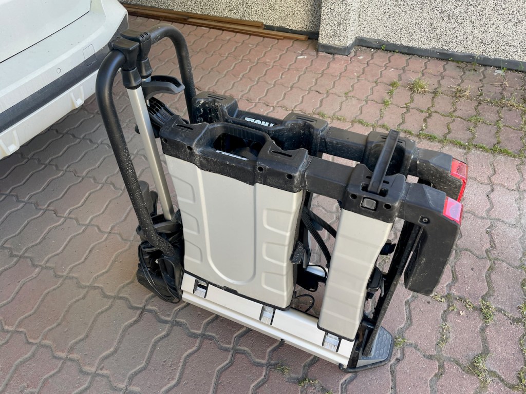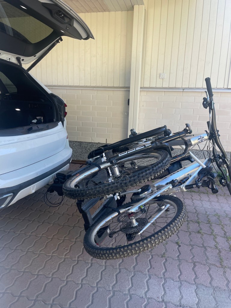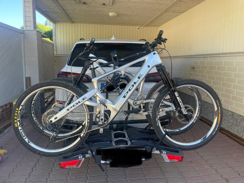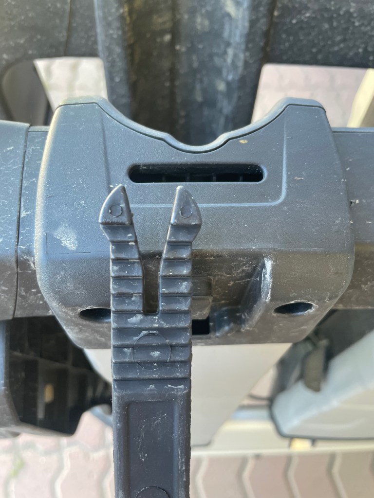 Tämmöiseen telineeseen pitää hakea rekisteröivältä katsastusasemalta kolmas kilpi. Kilpi kustantaa noin 30 euroa ja tulee parissa viikossa. Lisäkilvestä tehdään merkintä auton tietoihin ja odotusajan saa käyttää itsetehtyä kilpeä. Ongelmatonta pyörien laittaminen telineeseen ei ollut. Katsoin Thulen oman videon tästä telineestä ja sehän meni todella smoothisti. Kylläpä on näppärää! No, itse räpelsin tämän kanssa hermostuksiin asti, kun olisin halunnut laittaa sähköpyörän lähelle koukkua ja luomun kauemmas. Eipä onnistunut. Ongelmana tässä on, että pitkäjoustoinen pyörä on todella korkea ilman kuormaa. Voiman ollessa ensimmäisessä paikassa sen alaputki blokkasi koko tuon kaaren, johon ne kouravarret kiinnittyy. Varsien mitan säädön lisäksi tuote paranisi huomattavasti, jos tuon kaaren korkeus olisi myös säädettävissä. Toisaalta se voisi olla myös korkeampi ja siinä voisi olla välipuolia, joihin noita varsia saa kiinnitettyä haluamalleen korkeudelle. Minusta koura tulisi parhaiten pyörään, kun se tulisi yläputken päältä.