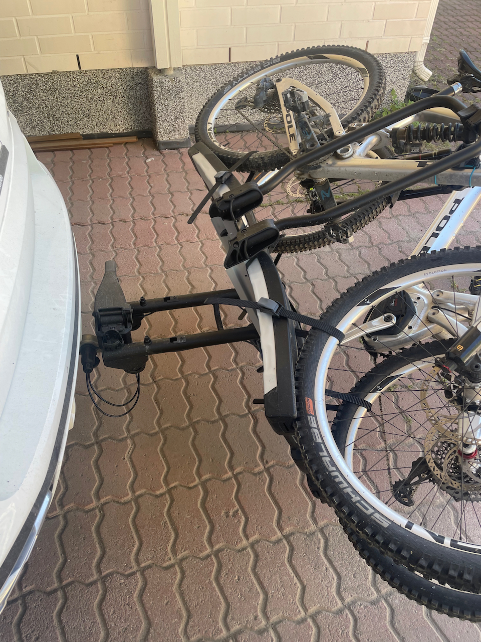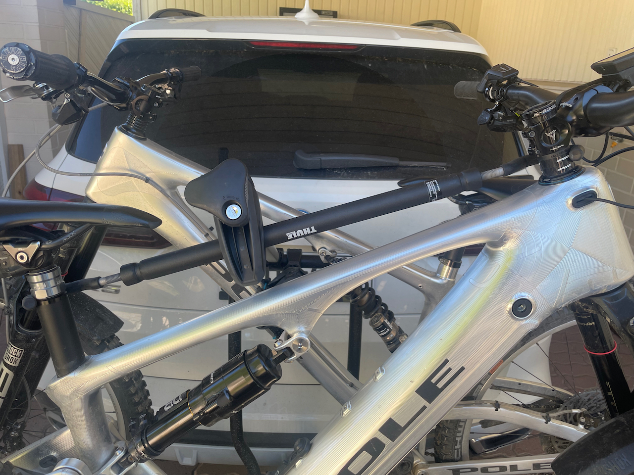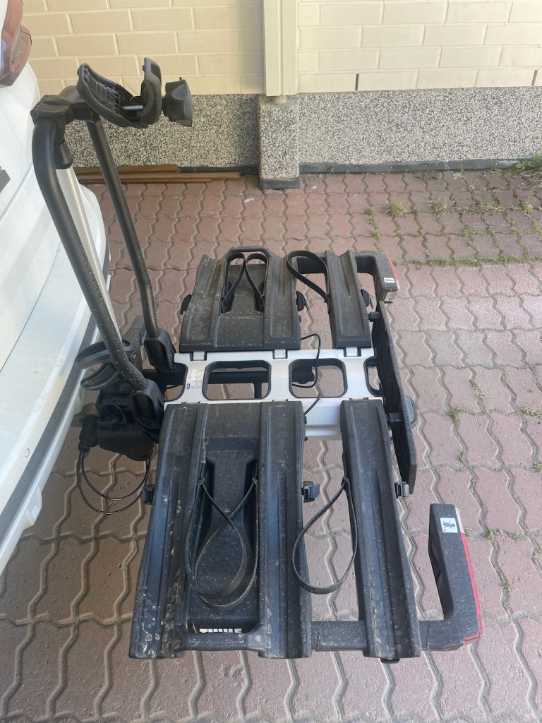 Tämmöiseen telineeseen pitää hakea rekisteröivältä katsastusasemalta kolmas kilpi. Kilpi kustantaa noin 30 euroa ja tulee parissa viikossa. Lisäkilvestä tehdään merkintä auton tietoihin ja odotusajan saa käyttää itsetehtyä kilpeä. Ongelmatonta pyörien laittaminen telineeseen ei ollut. Katsoin Thulen oman videon tästä telineestä ja sehän meni todella smoothisti. Kylläpä on näppärää! No, itse räpelsin tämän kanssa hermostuksiin asti, kun olisin halunnut laittaa sähköpyörän lähelle koukkua ja luomun kauemmas. Eipä onnistunut. Ongelmana tässä on, että pitkäjoustoinen pyörä on todella korkea ilman kuormaa. Voiman ollessa ensimmäisessä paikassa sen alaputki blokkasi koko tuon kaaren, johon ne kouravarret kiinnittyy. Varsien mitan säädön lisäksi tuote paranisi huomattavasti, jos tuon kaaren korkeus olisi myös säädettävissä. Toisaalta se voisi olla myös korkeampi ja siinä voisi olla välipuolia, joihin noita varsia saa kiinnitettyä haluamalleen korkeudelle. Minusta koura tulisi parhaiten pyörään, kun se tulisi yläputken päältä.
