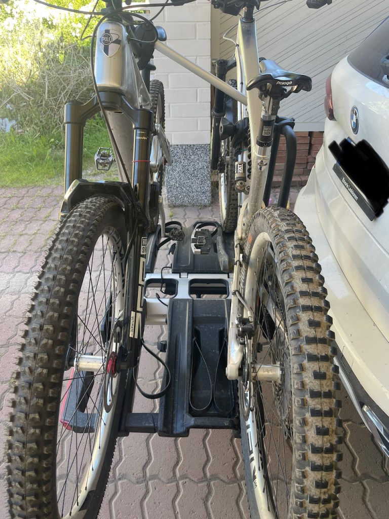 Valitsin kolmen pyörän mallin XT3, koska välillä voi oikeasti olla kyydissä useampi pyörä ja toisaalta tässä mallissa on hyvin tilaa järjestellä telineeseen kaksi kookasta pyörää. Valinta osoittautuikin oikeaksi jo heti alkuun yrittäessäni ährätä telineeseen Pole Stamina 180 K4 ja Pole Voima K3 pyöriä. Polen pyörien akseliväli on pyörämaailman pisimpiä, S180 K4 1360mm ja Voima K3 1340mm. Telineen spekseissä on mainittu 1300mm maksimina. Minusta pyörät istuu telineeseen kuitenkin hyvin. Jouduin vaihtamaan renkaiden kiinnitysremmit läskipyörämalleihin, että ne riittäisivät tarpeeksi reilusti näiden pitkien pyörien kiinnitykseen.