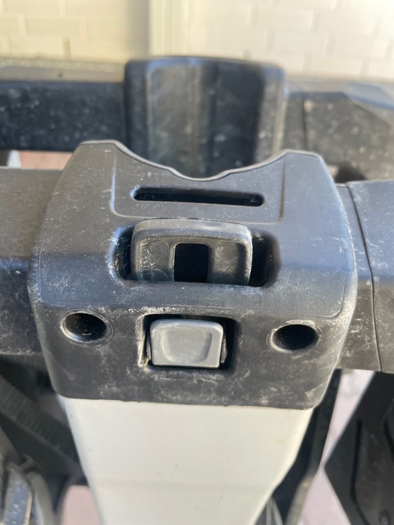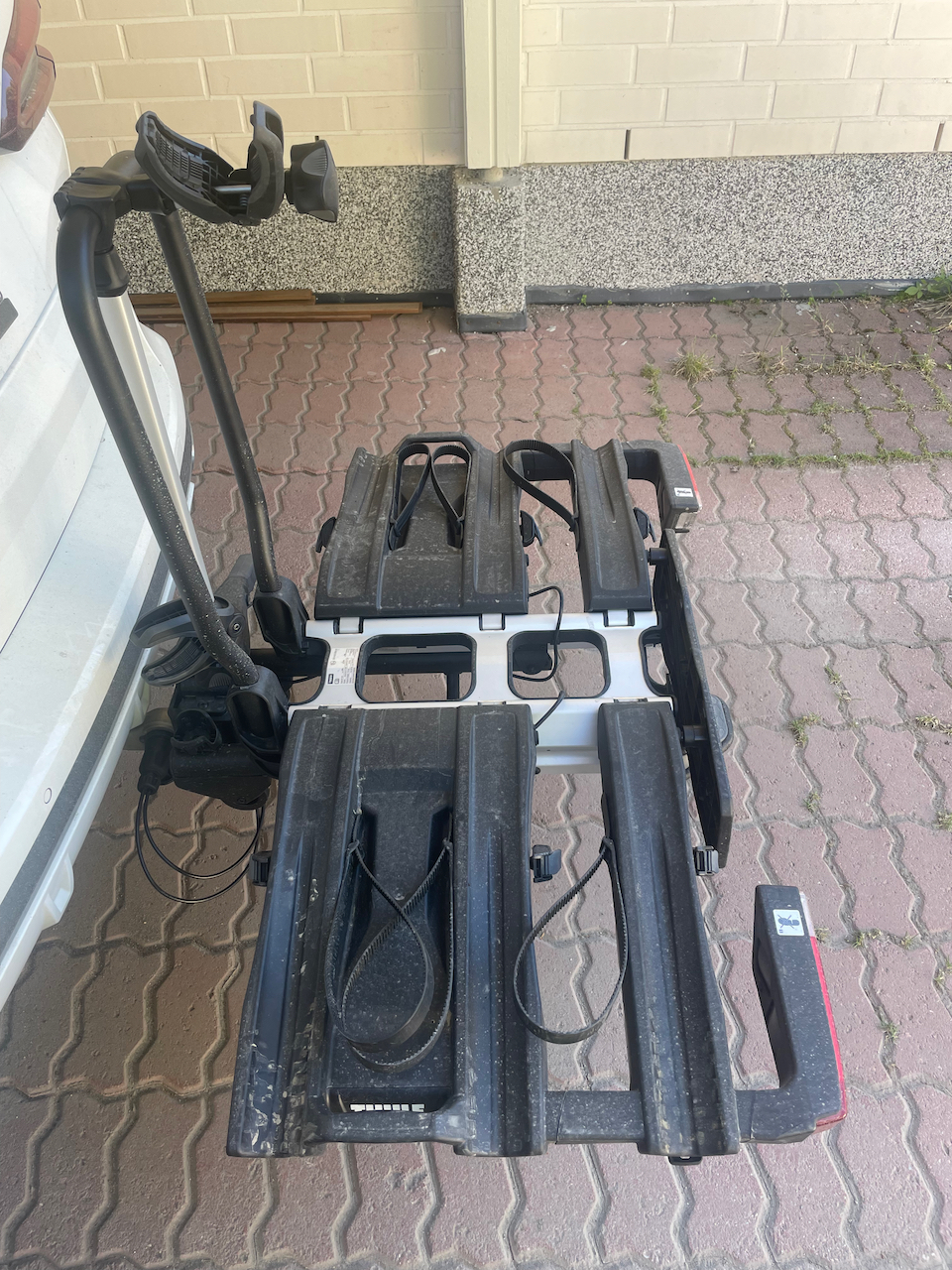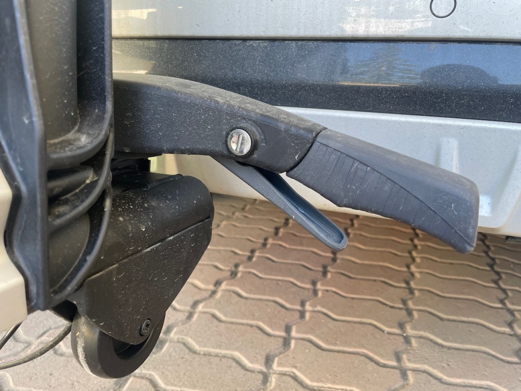 Teline on nyt kiinni autossa ja sen voi avata. Tätä varten täytyy irroittaa puolikkaat toisissaan pitävä panta, joka toimii samalla myös kahvana, jos telinettä vetää perässään sen alla olevien pyörien varassa. Tämän suunnittelu ei myöskään ansaitse ihan kymmentä pistettä. Idea on oikein hyvä, mutta toteutus sitten käytännössä hieman ontuu.