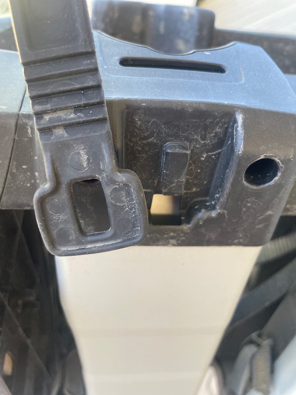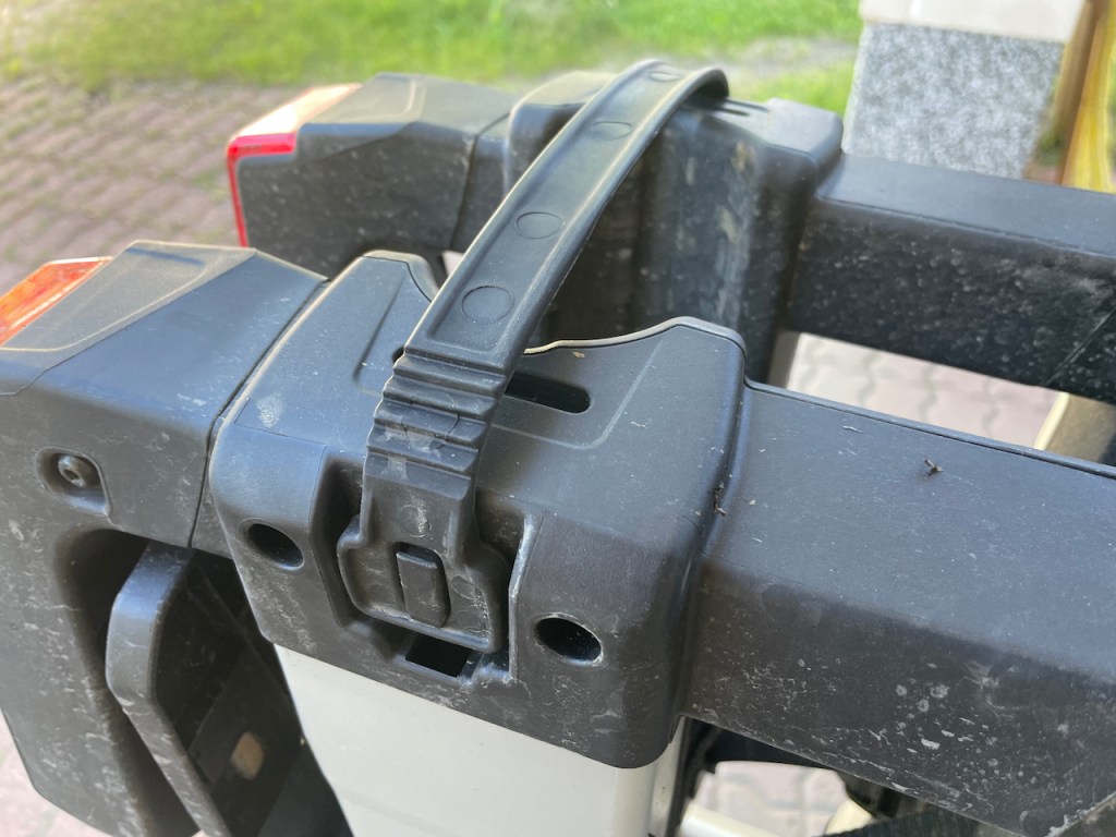 Peräkoukkuteline tulee tietysti kiinni auton sähköihin perävaunuliittimestä. Liittimelle on telineessä oma pidike, mutta se on toteutettu jotenkin kökösti. Pistoke ei ikäänkuin sovi pidikkeeseen kovin hyvin ja pienikin tökkäisy siihen saa sen tippumaan johtojensa varaan. Ärsyttävää, eikö kukaan testannut onnistuiko pidikkeen suunnittelu?